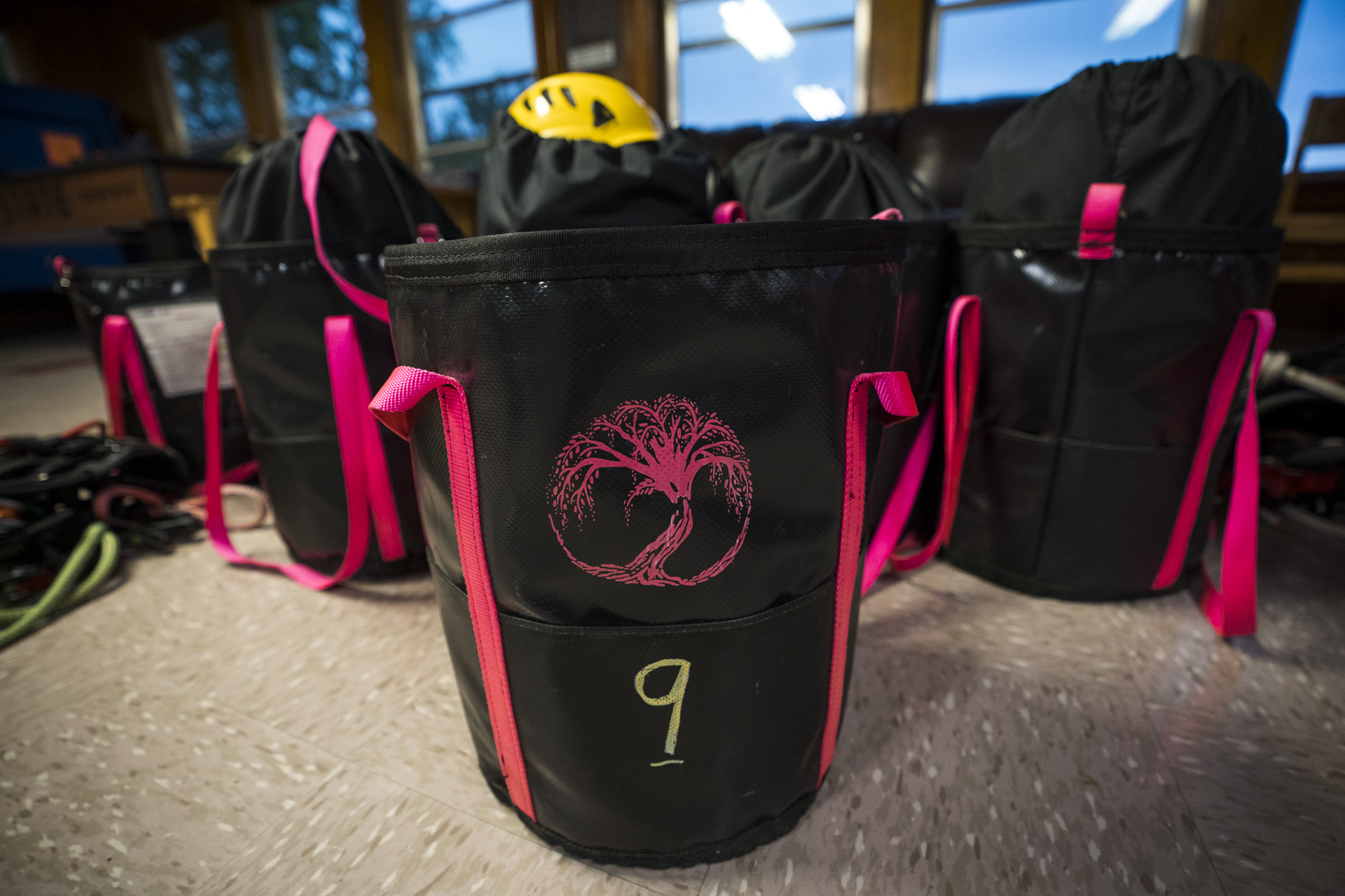 WTCW was founded by twin sisters, Melissa LeVangie Ingersoll and Bear LeVangie. Additional support throughout the workshop was provided by lead instructor Rebecca Seibel and local arborists and former WTCW students. The two and a half day workshop covered foundational skills, but with the opportunity and flexibility to learn advanced skills for those with prior experience. More than twenty kits were available to try on, including a range of harnesses, hitch climber pulleys, eye to eye hitch cords, carabiners and helmets.