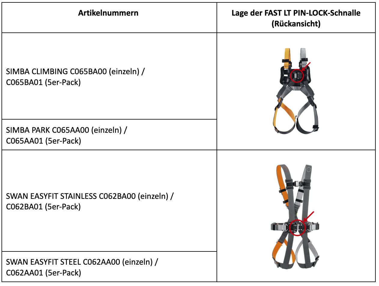 Wir haben die notwendigen Maßnahmen ergriffen, damit alle Gurte SIMBA CLIMBING, SIMBA PARK, SWAN EASYFIT STEEL und STAINLESS, die nach Januar 2026 verkauft werden, nicht von diesem Aufruf zur Überprüfung (individuelle Nummer nach 26A 0000000 000) betroffen sind.