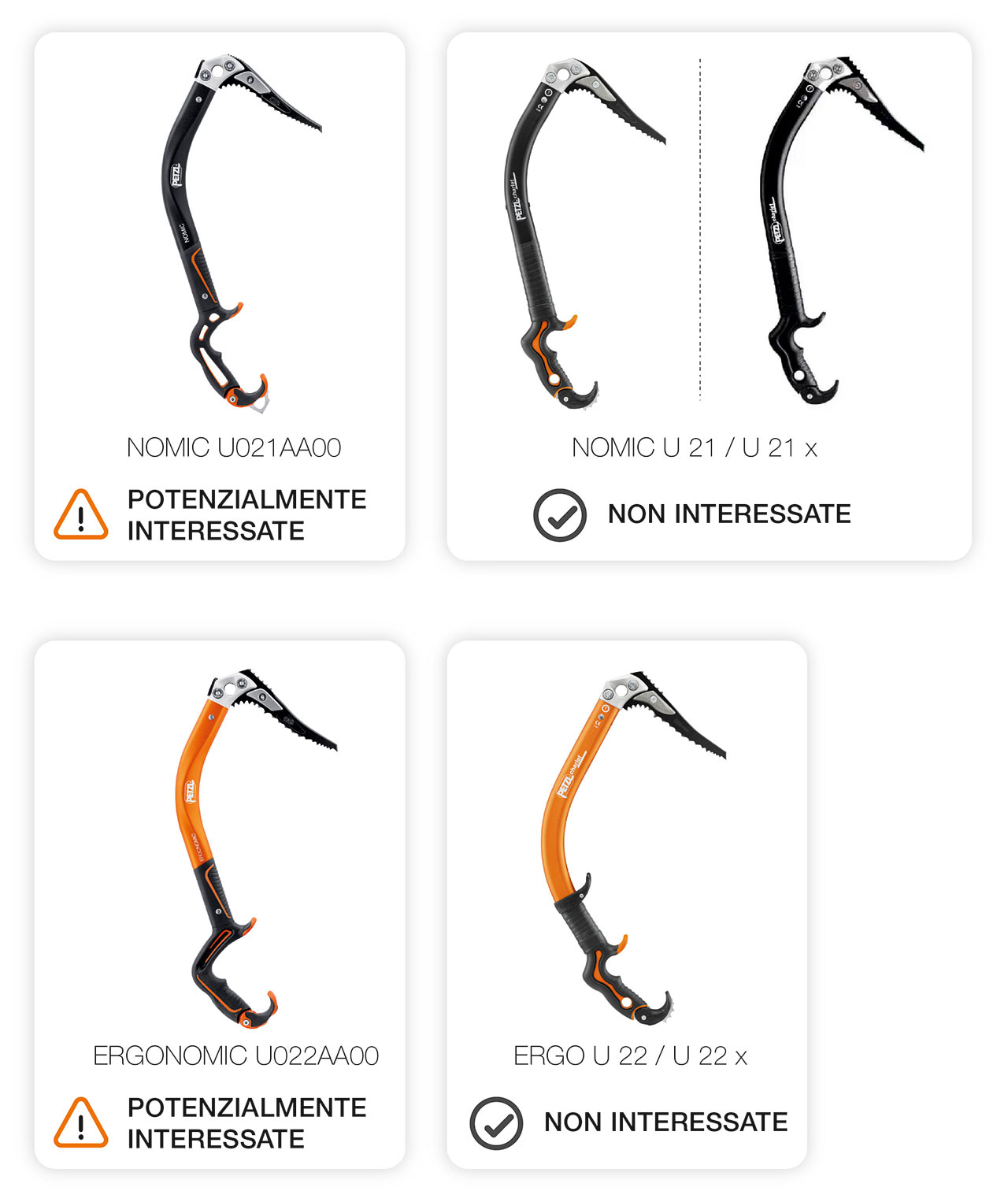 - Soltanto le piccozze NOMIC U021AA00 fabbricate tra dicembre 2017 e giugno 2020 sono interessate.