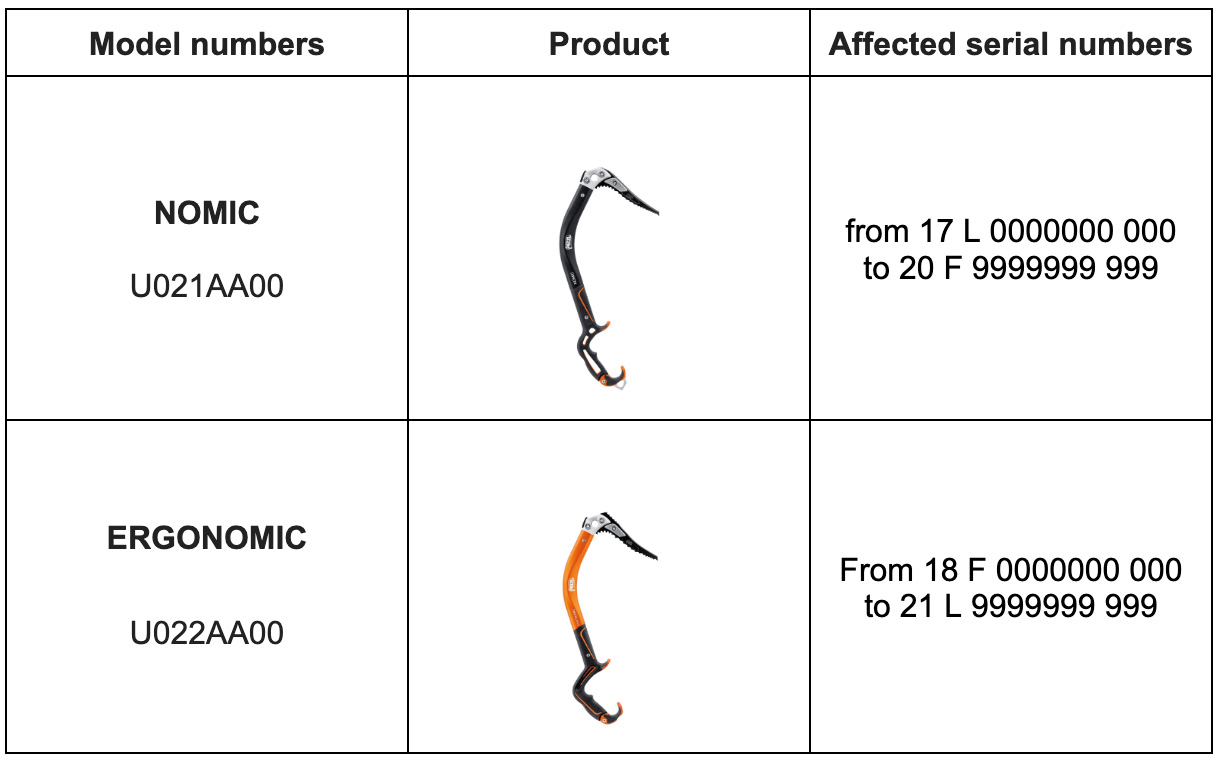 - Only NOMIC U021AA00 ice axes manufactured between December 2017 and June 2020 are affected.