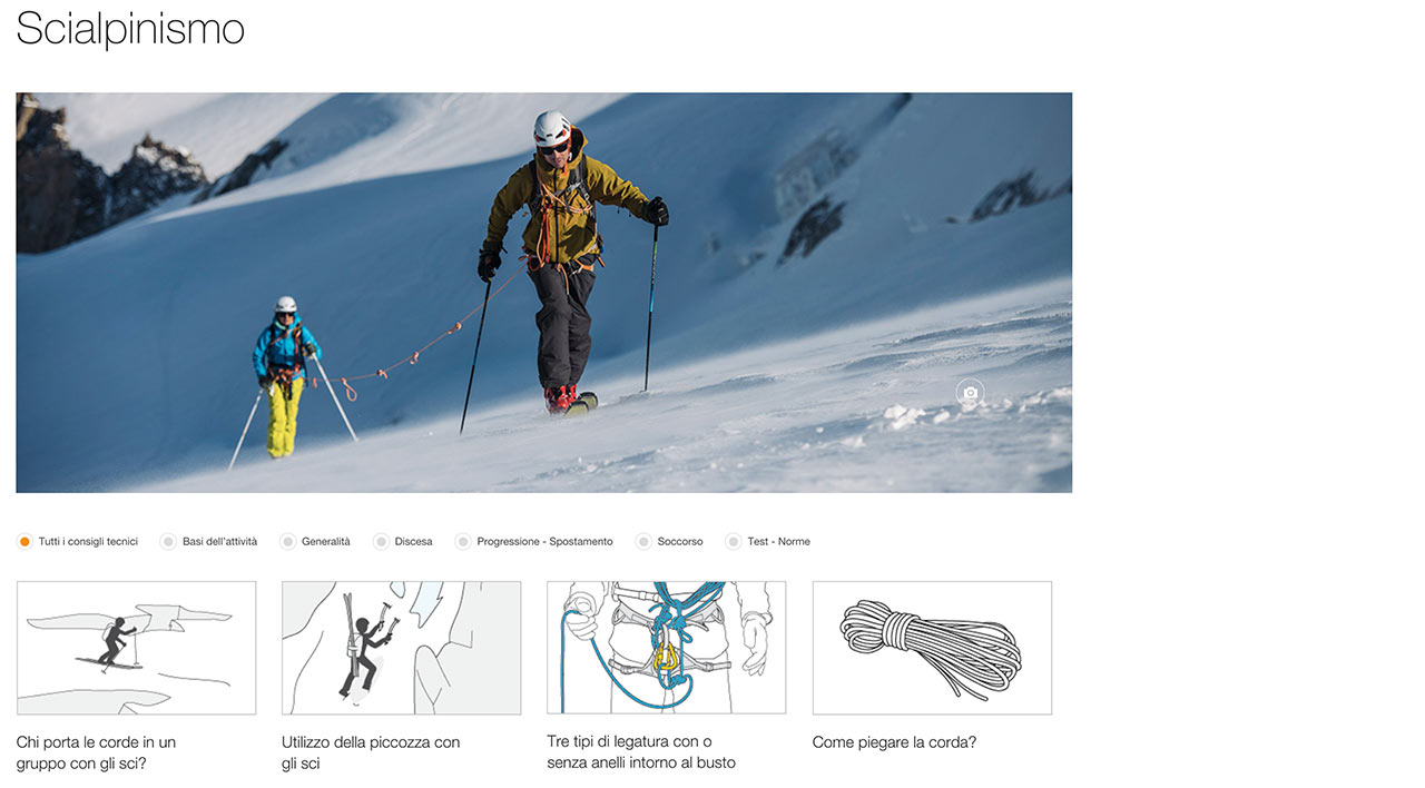 Su ogni pagina relativa a una specifica attività sportiva, troverete tutti i consigli tecnici suddivisi per capitolo: consigli base, movimento, discesa ...