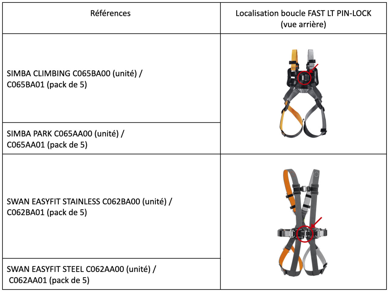 Harnais concernés et localisation de la boucle FAST LT PIN-LOCK