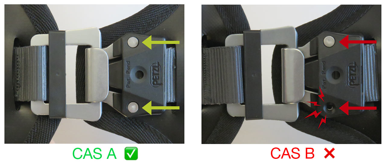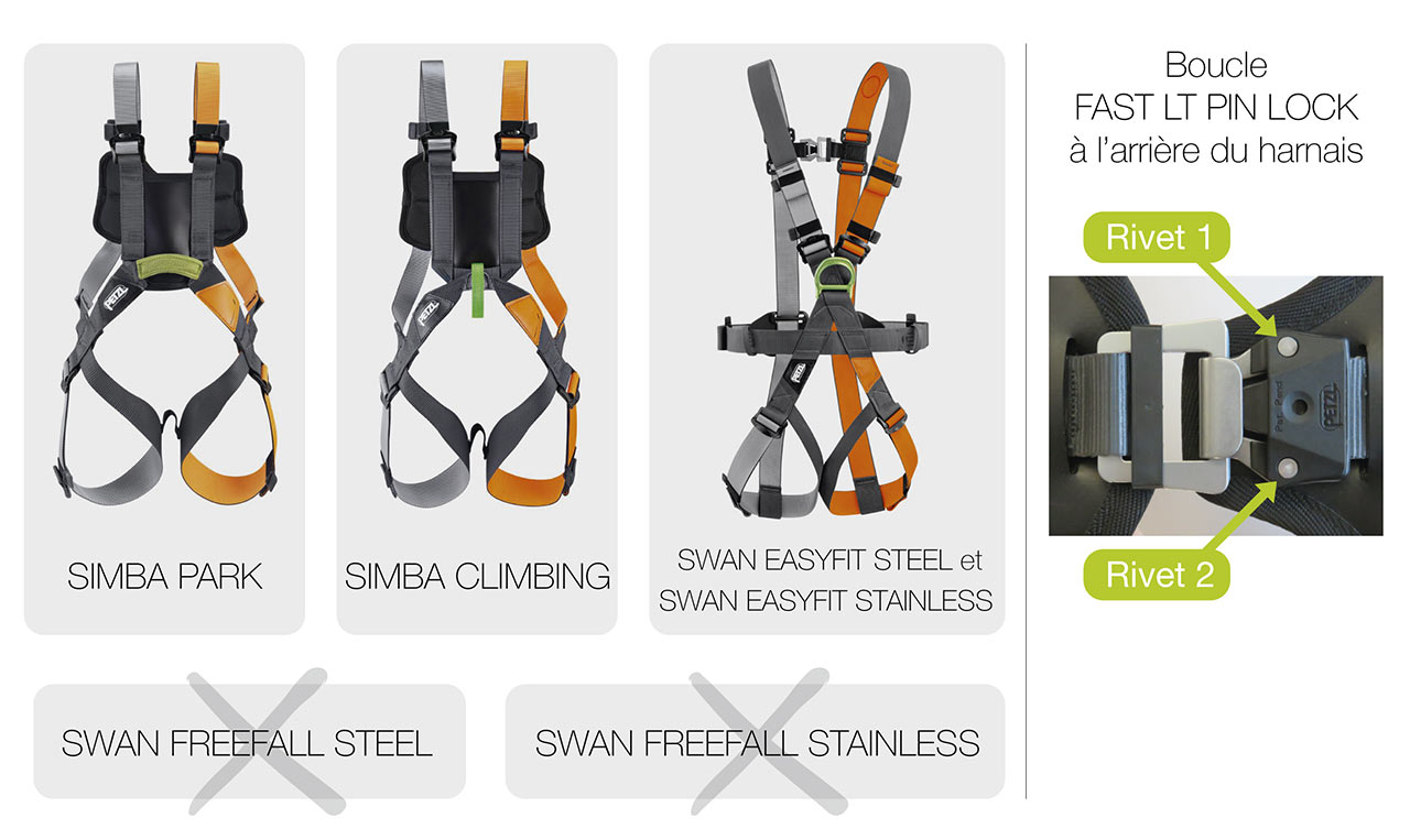 Vérifiez la présence des deux rivets haut et bas sur la boucle FAST LT PIN-LOCK des harnais concernés :