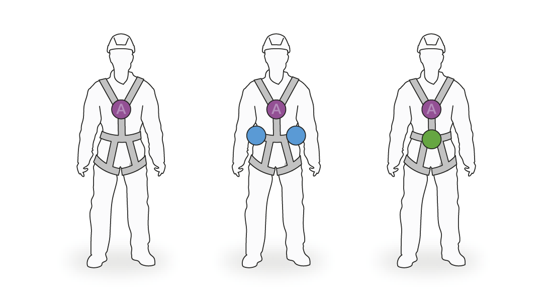 Petzl professional harnesses have a variety of shapes and levels of complexity, with between two and six certified attachment points. Each attachment point may be used for restraint.