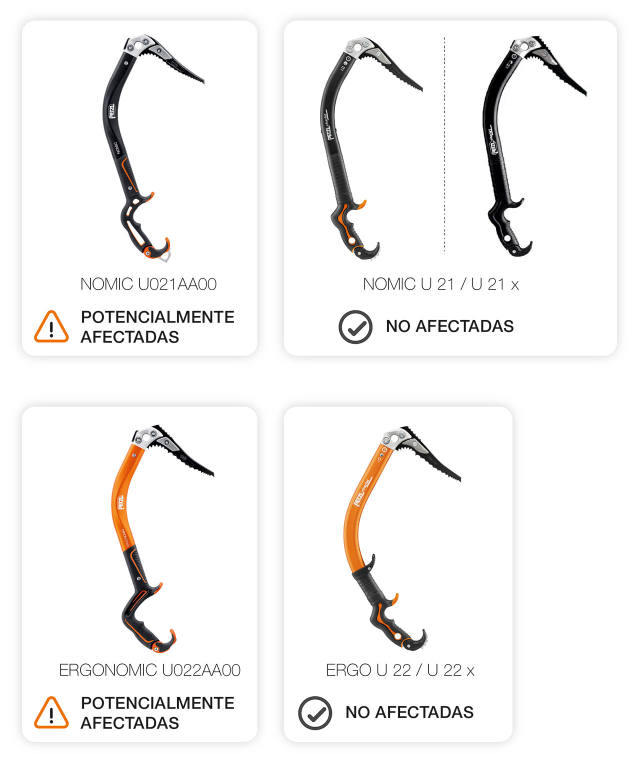 Nota: las versiones anteriores de piolets NOMIC (referencia U21 y U21 x) y ERGO (referencia U22 y U22 x) no están afectadas.