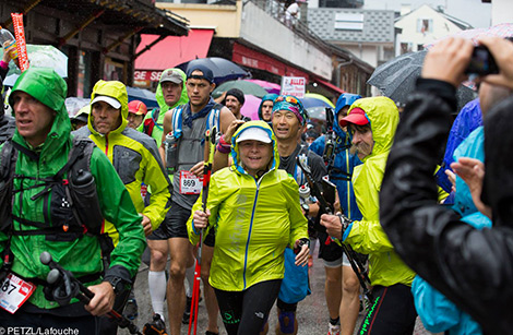 The impending thunderstorm did not seem to discourage the 2300 runners lined up at the starting line this afternoon. With nerves of steel they walked through the pouring rain down the streets of Chamonix 15 minutes before the start! The race will take 20 hours for the frontrunners and up to 46 hours for those who finish just before the final time barrier. Some will spend two nights running the 168 km around the Mont Blanc range, covering 9600 m of vertical gain.